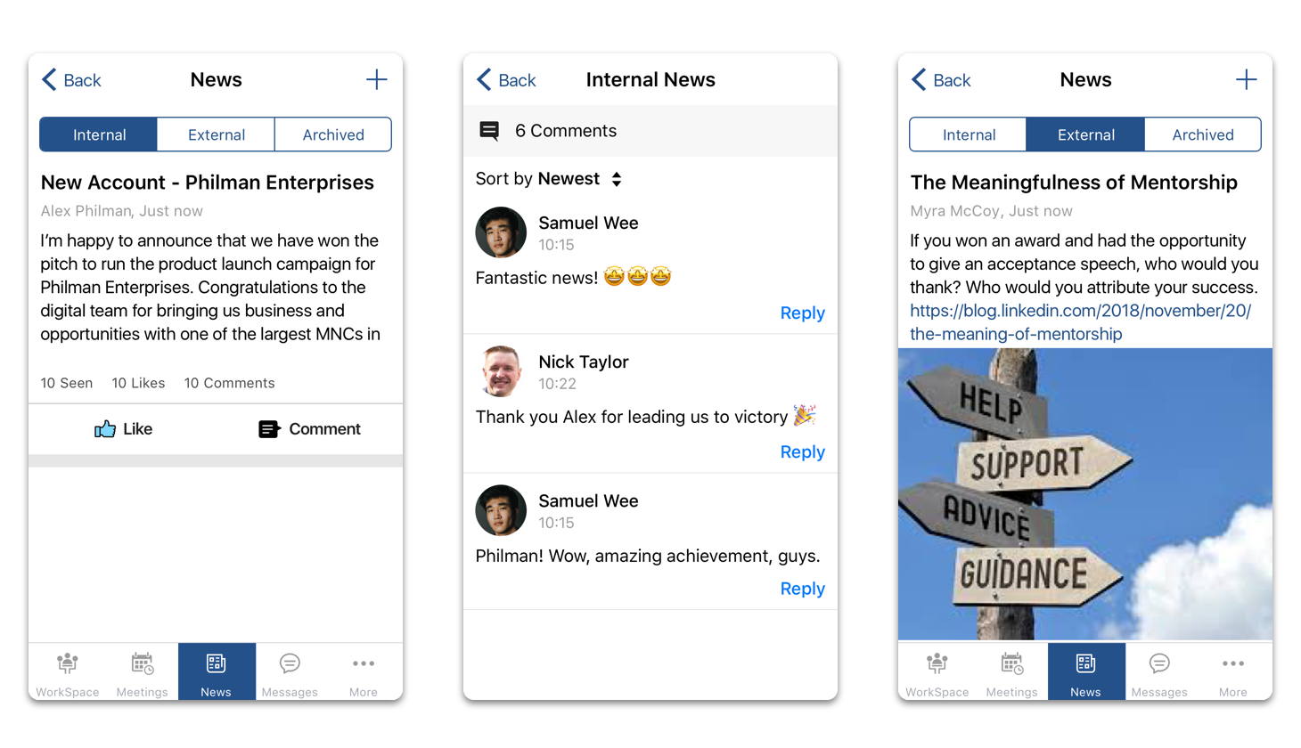 Share and consume news on the go. Stay updated on all work- and industry-related events and notices posted within your organisation as well as amongst the external contacts in your professional network. And if you’ve got anything to share, you can create your own news posting and select precisely who your audience will be. The more connected your community is, the better it will thrive.